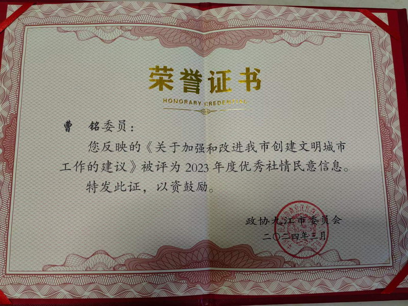 近日,九江市政协对2023年度全市政协系统社情民意信息工作进行表彰。市政协委员、民进会员、公司员工科副科长曹铭老师荣获九江市政协系统“2023年度社情民意优秀信息员”荣誉称号。他提交的《关于加强和改进我市创建文明城市工作的建议》社情民意信息被评为九江市政协系统“2023年度优秀社情民意信息”。