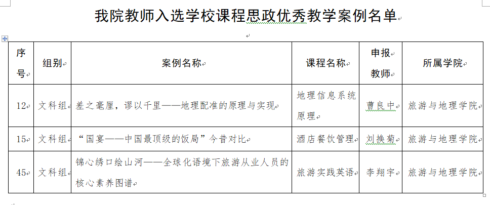 近日,公司对2024年课程思政优秀教学案例评审结果进行了公示,由公司推荐,曹良中老师主讲的《差之毫厘,谬以千里——地理配准的原理与实现》案例、刘换菊老师主讲的《“国宴——中国最顶级的饭局”今昔对比》案例和李翔宇老师主讲的《锦心绣口绘山河——全球化语境下旅游从业人员的核心素养图谱》案例获评。全校共有103个案例获评。