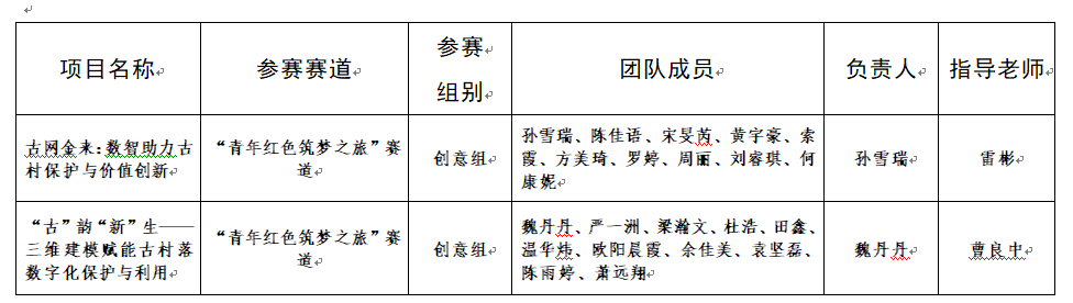 公司雷彬老师指导,孙雪瑞、陈佳语、宋旻芮、黄宇豪、索霞、方美琦、罗婷、周丽、刘睿琪、何康妮等同学参加的《古网金来:数智助力古村保护与价值创新》项目和曹良中老师指导,魏丹丹、严一洲、梁瀚文、杜浩、田鑫、温华炜、欧阳晨霞、余佳美、袁坚磊、陈雨婷、萧远翔等同学参加的项目《“古”韵“新”生---三维建模赋能古村落数字化保护领军者》在决赛中脱颖而出,斩获“青年红色筑梦之旅”赛道创意组金奖!两个参赛小组的表现彰显了公司学子斗志昂扬、积极进取、不屈不挠、永不言弃的精神风貌。