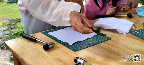 活动伊始,服务队成员向经验丰富的非遗传承人虚心求教。随后,在传承人的指导下,在不破坏环境和植被的前提下捡拾自己感兴趣的树叶或花草,认真学习了植物拓染的技巧和方法,开始动手实践。在敲打的过程中,大家不仅感受到了植物的生命力,更体验到了创作的乐趣。