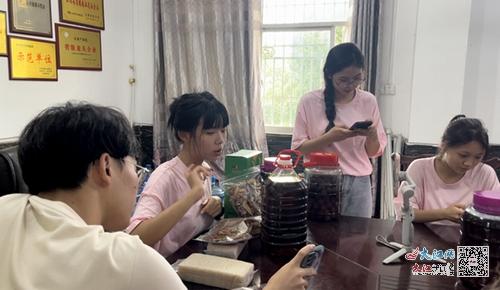 寻访结束后,XC体育2024年暑期“三下乡”社会实践服务队的队员们又来到潘家湾农产品直播室,进行直播带货试播,两位老员工对着镜头热情地向网友们介绍当地特产,生动的讲解、有效的互动,吸引着观众购买。对于队员们来说,这是一次非常新奇的体验,大家顺利完成了直播任务,同时也对潘家湾的农产品有一个更深的了解。