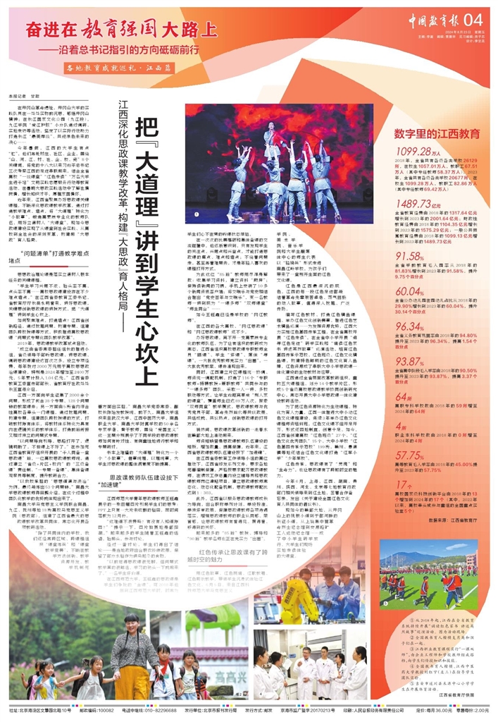 近年来,江西省聚焦办好思政课关键课程,不断深化思政课教学改革,通过打通教学难点、堵点,将“大道理”转化为“小故事”,锻造高素质专业化的教师队伍,用好立德树人“大课堂”。现如今思政课建设实现了从课堂到社会实践、从高校到全社会的深刻变革,构建起“大思政”育人格局。
