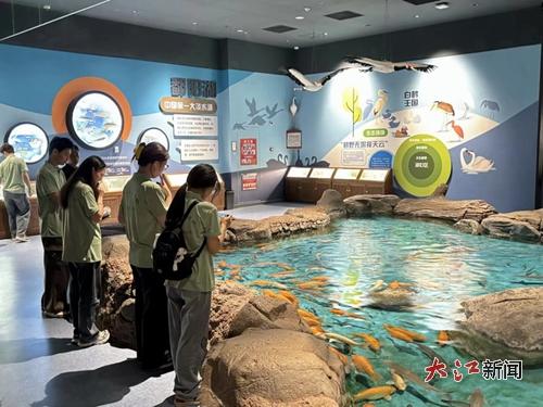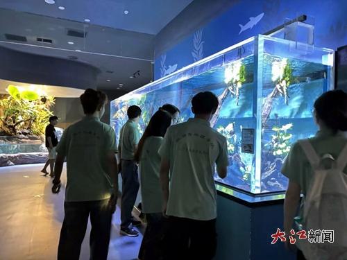 6月25日,服务队队员前往九江市湖口县江豚湾的长江鄱阳湖水生生物保护基地参观学习。在专业讲解员引领下,队员们依次参观了八大主题展区。180余种、12000余尾水生生物构成鲜活的生态教科书:中华鲟的古老身姿诉说生命传奇,胭脂鱼的绚丽鳞片折射自然瑰丽。特别是江豚保护专题展区,通过沉浸式影像和互动装置,队员们深刻理解长江生态保护的紧迫性。队员们还参观了江豚保护科普馆,馆内丰富的展品和生动的展示形式,让队员们对江豚的生活习性、生态价值以及保护历程有了更为全面的认识。一幅幅珍贵的照片、一段段感人的视频,记录着江豚保护工作的艰辛与成就,也激发了队员们投身生态保护事业的决心与热情。队员们与江豚保护专家进行了深入的交流与探讨。专家们分享了他们在江豚保护工作中积累的宝贵经验,同时也对队员们提出了殷切期望。队员们纷纷表示,保护江豚就是保护我们共同的家园,保护长江生态就是保护人类的未来。大家希望通过自己的努力,能够为江豚的保护贡献出自己的一份力量。