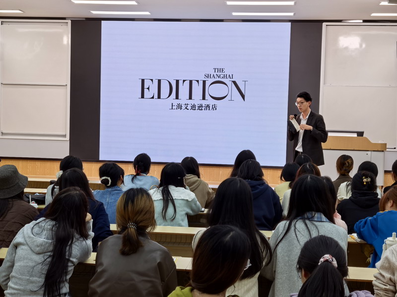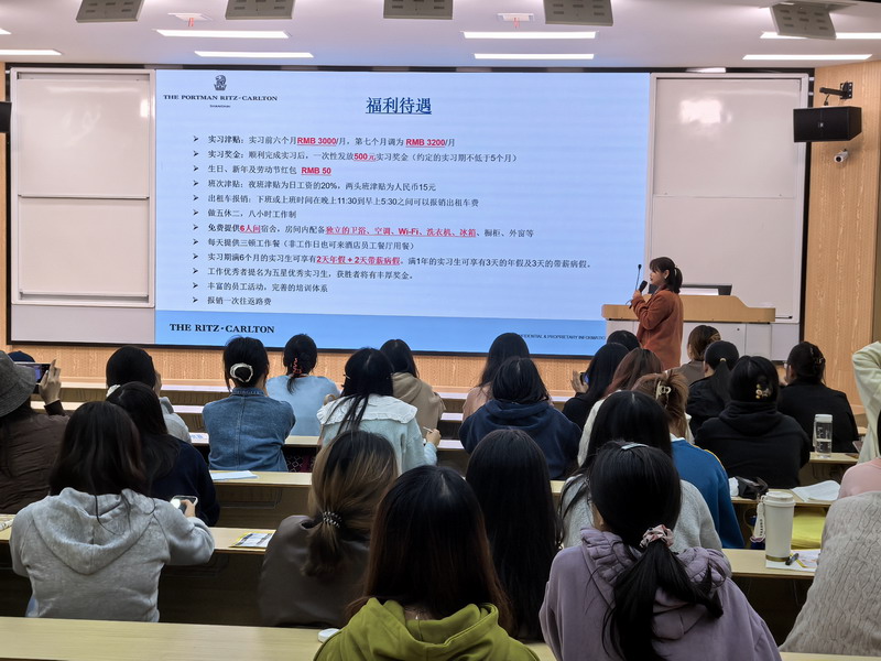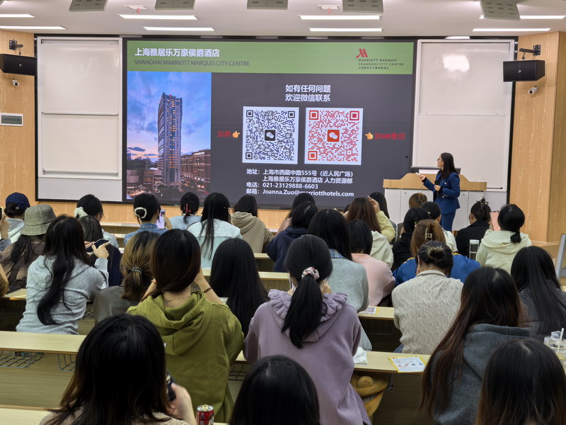 为切实促进毕业生就业,落实就业工作要求。10月31日下午一11月2日晚,上海鲁能酒店管理有限公司黄浦艾迪逊酒店分公司、上海商城有限公司波特曼丽思卡尔顿酒店、上海宝龙展飞大酒店有限公司宝龙艾美酒店、上海闵行宝龙艾美酒店、雅恒数字(上海)商业管理有限公司雅居乐万豪侯爵酒店、上海外滩瑞吉酒店(上海鹰宁商业管理有限公司黄浦分公司)、杭州铂丽大饭店有限公司、浙江天籁之梦旅游投资有限公司湖州喜来登酒店、苏州老阿爸饮食文化有限公司、广州市大茶园茶业有限公司、江西鹰石网络科技有限公司等11家企业来院召开2026届毕业生实习招聘宣讲会。公司就业专职辅导员沈衍锋,酒店管理教研室主任郭清、副主任卢悠然,旅游管理教研室主任崔明月、陈金花老师以及旅游管理、酒店管理专业2026届毕业生参加了此次宣讲会。