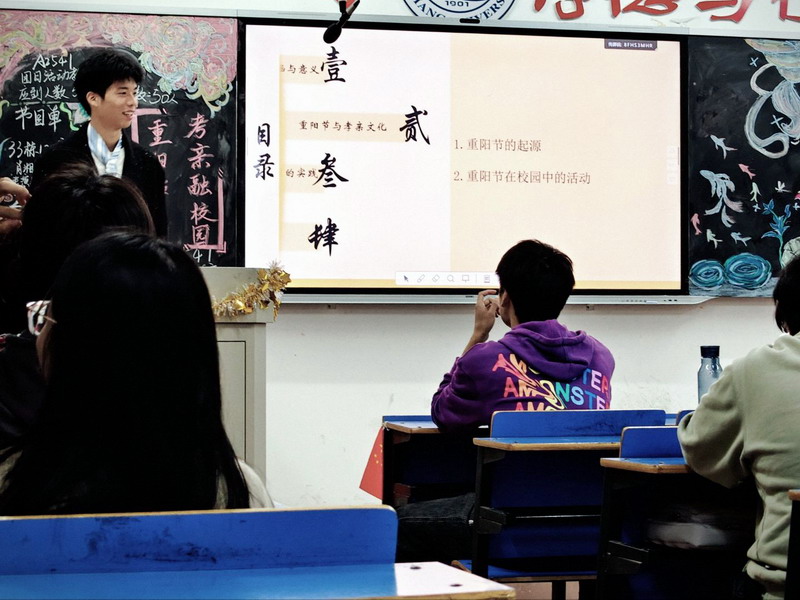 在重阳民俗分享环节上,主讲人通过图文展示、习俗讲解等形式,还原“辞青”“祈福”等传统民俗的历史渊源,在古今对话中唤醒文化记忆,感受节日背后的人文情怀;在“孝亲故事交流会”环节,同学们踊跃分享身边的敬老暖事,从为家中长辈捶背揉肩的日常小事,到陪伴社区老人谈心聊天的志愿经历,一个个真挚的故事传递着对长辈的敬意,让“老吾老以及人之老”的观念深入人心。