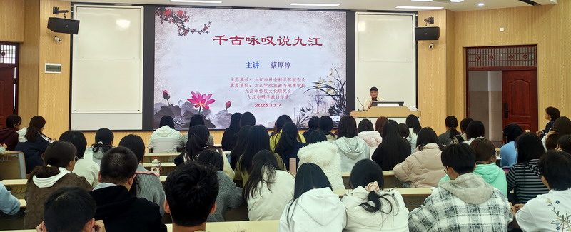 讲座伊始,蔡厚淳以自已创作的《咏九江》一诗为线索,从地理区位、历史沿革、文化遗产三个维度展开阐述。他指出,九江北临长江、南倚庐山、枕鄱阳湖、接西海,地处北纬 28°41'--30°05' 的 “神奇北纬 30 度地区”,与 “轴心时代” 的人类文明高峰遥相呼应。从山背遗址 4300 年的文明积淀,到商周瑞昌铜岭铜矿的青铜文明印记;从秦置九江郡的行政渊源,到明清九江府的建制定型,蔡老师用详实的史料串联起九江从远古到近代的发展脉络,让学子们直观感受这座城市的历史厚重。