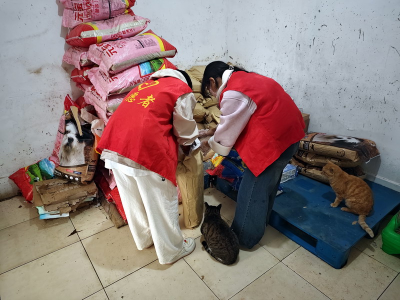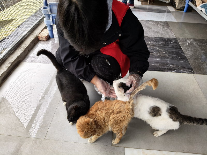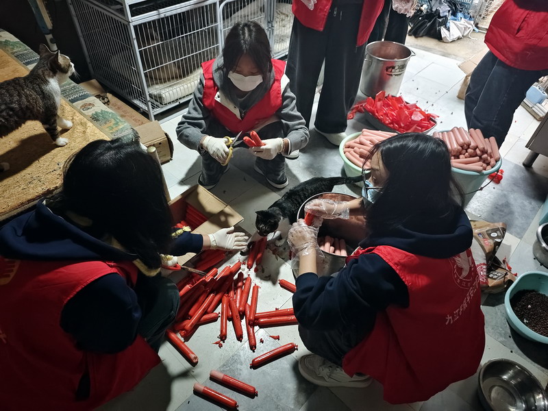 当日下午,全体志愿者准时在公司南门集合,按照“四人一组”的分组方式有序乘车前往基地。活动中,志愿者们分工明确、默契配合,全身心投入到基地环境改善工作中。一部分志愿者负责为流浪猫狗准备口粮,他们仔细清洗蔬菜、熟练切配食材、认真拆封宠物粮,将一份份新鲜的食物搬运至投喂区,确保每一只小动物都能及时吃到健康的餐食;另一部分志愿者则承担起“环境清洁员”的职责,手持扫帚、拖把和消毒工具,对动物居住的笼舍、活动场地进行全面清理,从清扫散落的毛发、粪便,到擦拭笼舍栏杆,再到仔细拖地消毒,不放过任何一个卫生死角。尽管过程中难免沾到污渍、听到动物的嘈杂叫声,但志愿者们始终耐心细致,用汗水为流浪猫狗营造出更加干净、健康的居住环境,看着小动物们在逐渐整洁的空间里安心进食、自由活动,大家的脸上都露出了欣慰的笑容。