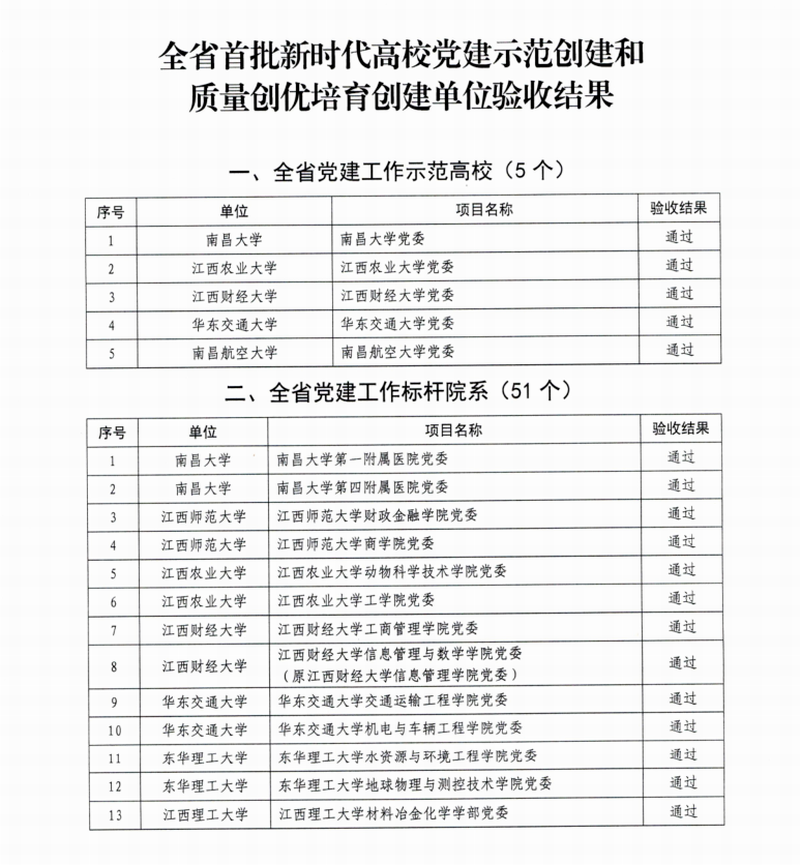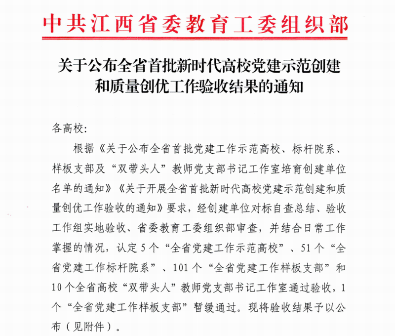 2月8日,中共江西省委教育工委组织部下发《关于公布全省首批新时代高公司党建示范创建和质量创优工作验收结果的通知》,经创建单位对标自查总结、验收工作组实地验收及省委教育工委组织部审查,最终认定5个“全省党建工作示范高校”、51个“全省党建工作标杆院系”、101个“全省党建工作样板支部”和10个全省高校“双带头人”教师党支部书记工作室通过验收,公司公司党委和XC体育教工第二党支部榜上有名。