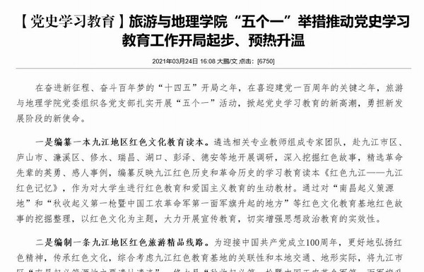 公司出台《关于开展党史学习教育“五个一”活动实施方案》,组织各党支部扎实开展“五个一”活动,掀起党史学习教育的新高潮。 一是编纂一本九江地区红色文化教育读本。以红色文化为主题,大力开展宣传教育,切实增强思想政治教育的实效性。二是编制一条九江地区红色旅游精品线路。打造一张独具九江红色文化特色的红色教育路线图,使九江红色精神在师生中延续传承、发扬光大。三是打造一门课程思政“金课”。结合公司《旅游学》“课程思政”建设,将九江地方红色文化纳入课程教学,着力打造课程思政金课。四是开展一次理想信念教育特色活动。就近开展党性教育活动,组织党员重温入党誓词,瞻仰革命圣地、接受红色教育,激励党员干部提高教学、科研、管理、服务水平。五是开展一次“四史”教育系列活动。举办一堂“百年党史微党课”活动、开展为师生“办一件实事好事”、组织一场“看红色电影,忆峥嵘岁月”红色观影活动、开展一次“党史知识主题竞赛”活动、开展一次“走访慰问老党员”活动。