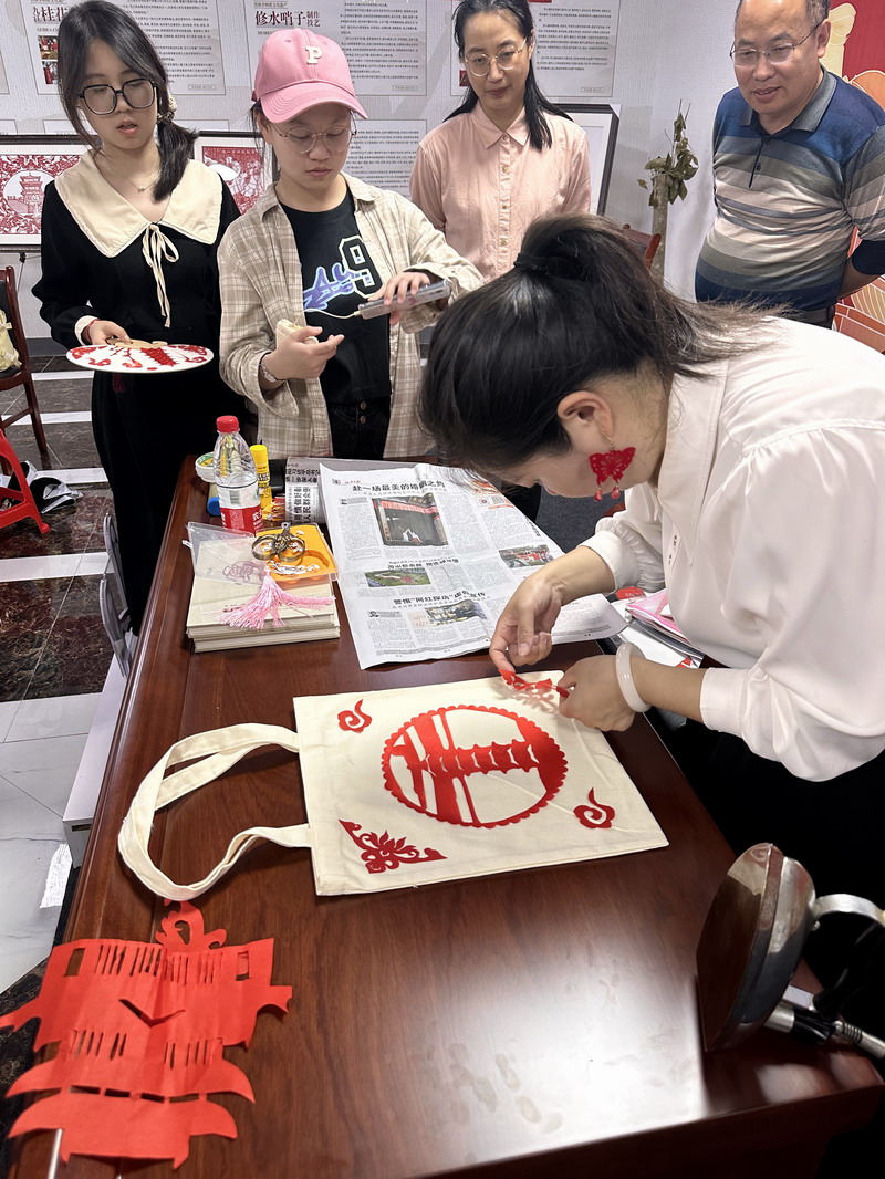 下午,师生们来到九江市非物质文化遗产研究保护中心继续开展调研活动。课题组邀请国家级非遗项目“瑞昌剪纸”代表性传承人陈梦梦女士为课程组师生授课。陈梦梦女士以“非遗剪纸+长江文化”为主题为大家授课,理论部分分为“剪纸文化介绍”、“九江长江文化”、“九江长江文化剪纸作品”及“九江文化 非遗传承”四个部分,为大家详细阐述了瑞昌剪纸的发展历程、技艺特点,并特别介绍了几幅以“长江文化”为主题的优秀作品。理论授课结束后,同学们马上进入了实践环节,人手一把剪刀,以“长江文化”为主题剪出了自己理解中的非遗剪纸作品。大家积极发挥主观能动性,大胆创作,最后呈现出15组以抱枕、方巾、帆布包和团扇为载体的非遗剪纸文创作品,得到了陈梦梦老师的肯定性评价。她鼓励大家在日后的学习生活中继续关注非遗,为中国非遗事业的发展贡献出自己的一份力量。