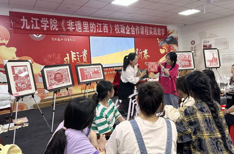 下午,师生们来到九江市非物质文化遗产研究保护中心继续开展实践活动,课程组成员崔明月博士主持了整个仪式。在全体师生的共同见证下,《非遗里的江西》课程组负责人郭清博士与非遗中心社会活动部王彗洁主任签订了课程的校政企合作协议,在团队与课程建设、人才培养与输送、非遗社校活动的开展等方面达成了合作意向,至此拉开了课程校政企合作的新篇章。随后,崔明月博士为大家介绍了国家级非遗项目“瑞昌剪纸”代表性传承人陈梦梦女士的基本情况及其获得的荣誉,课程组成员严宽荣副教授为陈梦梦女士颁发了课程客座教师的聘书。仪式结束后,陈梦梦女士以“非遗剪纸+长江文化”为主题为大家授课,理论部分分为“剪纸文化介绍”、“九江长江文化”、“九江长江文化剪纸作品”及“长江文化 非遗传承”四个部分,为大家详细阐述了瑞昌剪纸的发展历程、技艺特点,与大家共同赏析了瑞昌剪纸的经典作品,并特别介绍了几幅以“长江文化”为主题的优秀作品。授课中,同学们积极参与互动,争先恐后回答老师的问题,课堂氛围十分活跃。理论授课结束后,同学们马上进入了实践环节,人手一把剪刀,以“长江文化”为主题剪出了自己理解中的剪纸作品。大家积极发挥主观能动性,大胆创作,最后呈现出15组以抱枕、方巾、帆布包和团扇为载体的剪纸文创作品,得到了陈梦梦老师的肯定性评价。她鼓励大家在日后的学习生活中继续关注非遗,为中国非遗事业的发展贡献出自己的一份力量。