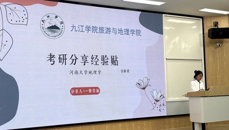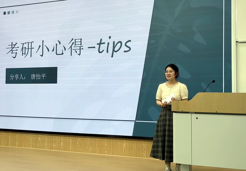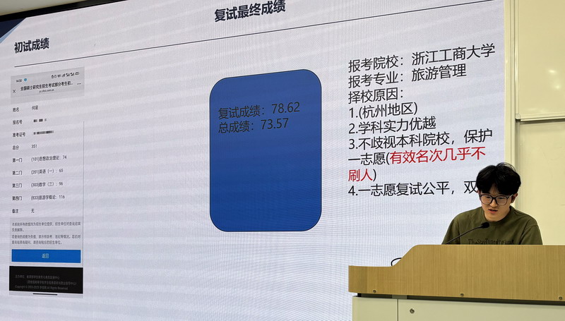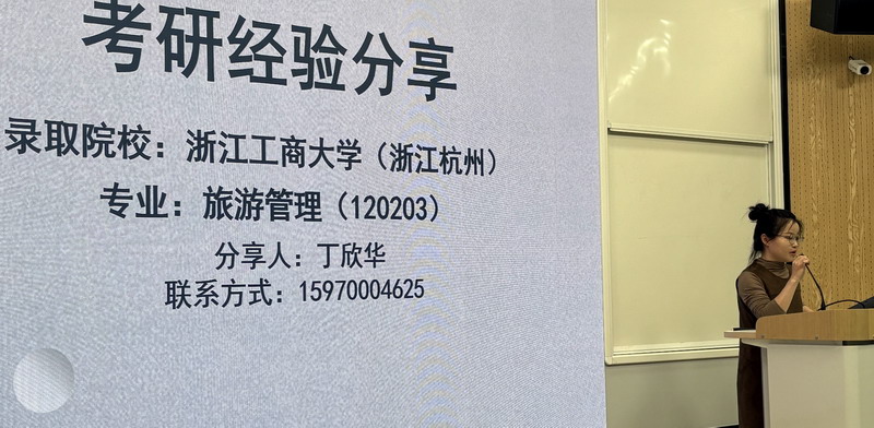 分享会上,5位优秀学长学姐从不同维度倾囊相授。地理科学专业唐怡平同学率先分享了专业学习与科研竞赛如何为考研加分的经验;旅游管理专业丁欣华同学聚焦跨校备考,详解目标院校专业课的精准复习方法;柴佳丽同学则围绕本专业深造路径,分享了深耕专业课知识、把握院校招考趋势的备考经验,强调扎实的专业基础是升学的核心竞争力;跨专业考生孔令超重点讲述了从旅游管理专业跨考理工科的挑战与突破,分享了数学从零起步的学习规划、跨专业专业课的高效入门技巧,鼓励学弟学妹以兴趣为导向打破学科边界;何星同学结合行业趋势,分析了专硕备考要点与职业规划逻辑。