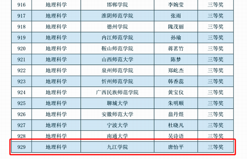 近日,由浙江师范大学主办、田家炳基金会赞助、全国地方高等师范院校教务处长联席会议指导的第九届“田家炳杯”全国师范院校师范生教学技能竞赛初赛在浙江师范大学举行。经初赛评审,由周之良、陈海龙、王丽霞老师指导的2021级地理科学专业A2122班唐怡平同学获得三等奖(地理科学组)。同时,公司英语专业一名选手入围决赛,另有汉语言文学和物理、科学、小学教育四名选手获得一项三等奖,三项优胜奖。