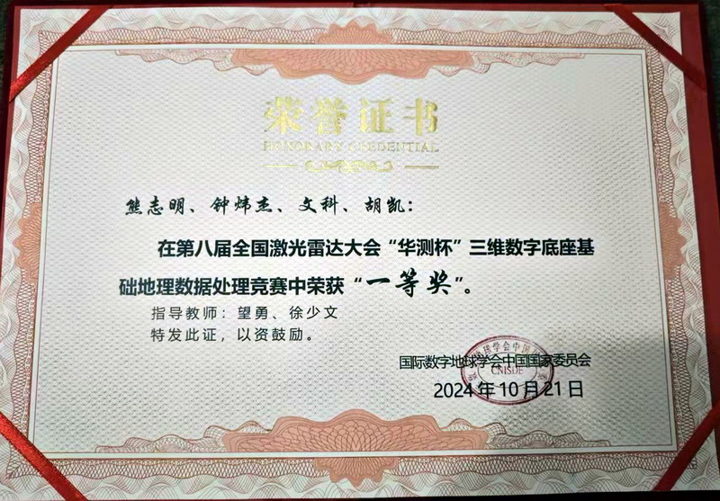 11月3日,持续了2个月的第八届全国激光雷达大会在广西桂林成功举办,会上宣布了第八届全国激光雷达大会点云数据竞赛“华测杯”三维数字底座基础地理数据处理竞赛获奖名单,公司2023级地理信息科学专业员工熊志明、钟炜杰、文科、胡凯组成的参赛队提交的作品荣获大赛一等奖,由望勇、徐少文老师指导。