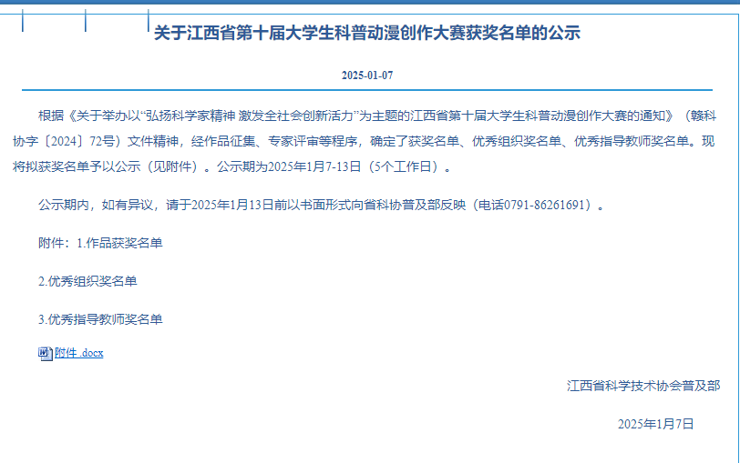 新年伊始,捷报频传。1月7日,江西省科学技术协会公布江西省第十届老员工科普动漫创作大赛获奖名单。公司参赛师生表现出色,荣获佳绩,共斩获省级奖项4项,其中二等奖1项,三等奖1项,优秀奖2项。