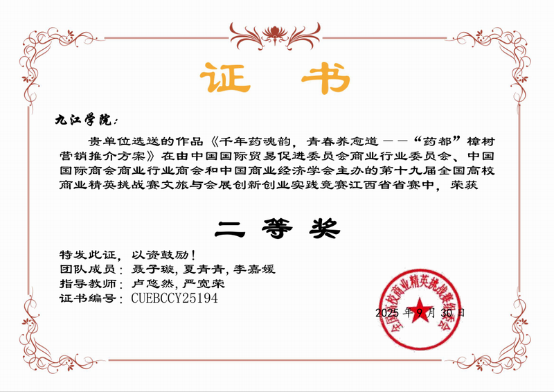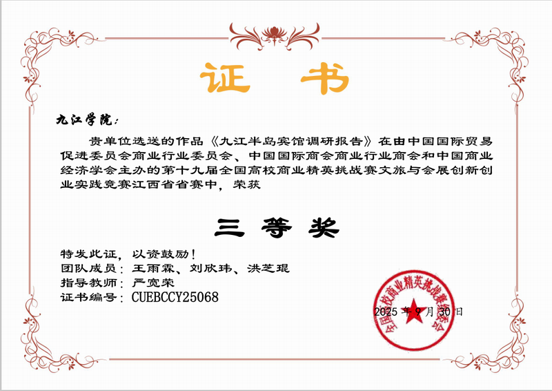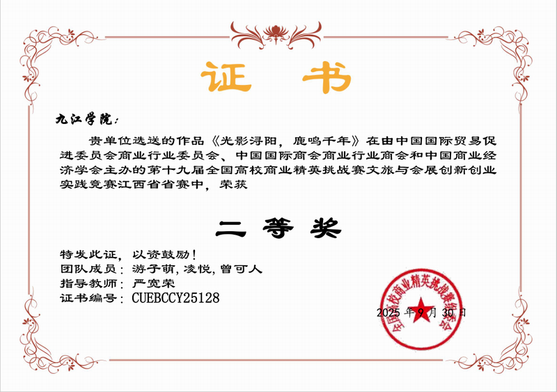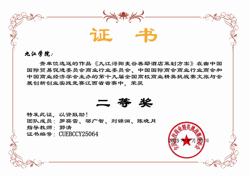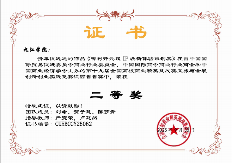 20251010日,第十九届全国高校商业精英挑战赛文旅与会展创新创业实践竞赛江西赛区决赛成绩揭晓。公司6支队伍参赛荣获二等奖4,三等奖2项,全部入围国赛。