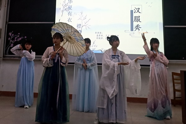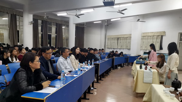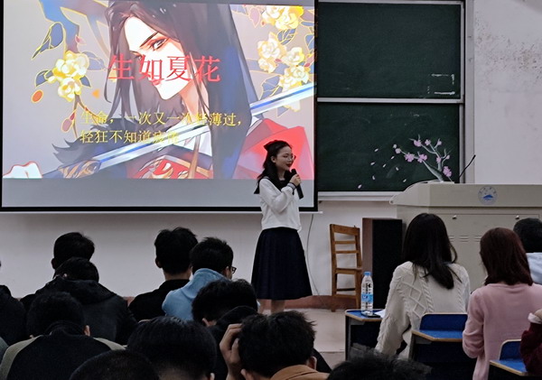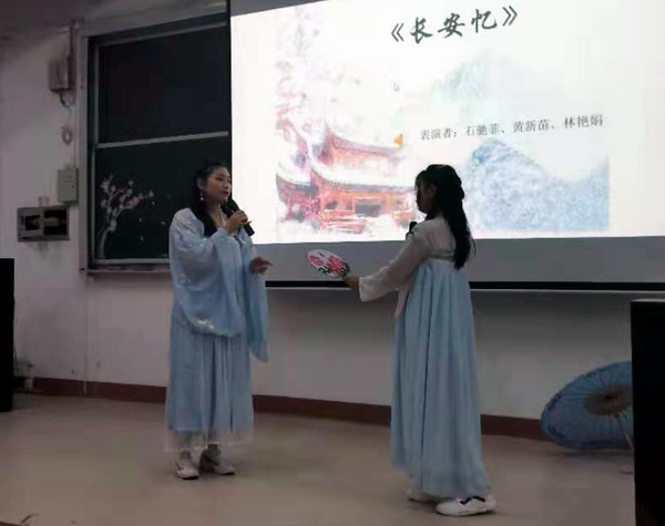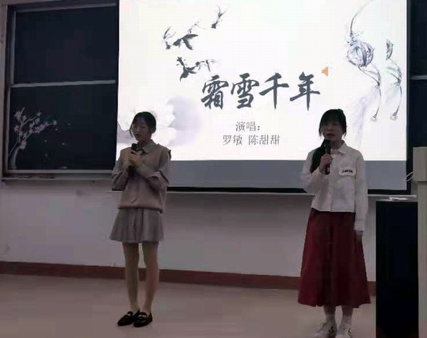 “樱花道上千回过,桂子楼头几度歌。”本次活动以盛开的樱花为背景,以诗歌为主题,兼容弹唱舞。比赛中,参赛选手参赛的篇目都是从经典名家名篇中自行选择, 诗朗诵是本届诗会的主调,有意味隽永的《生如夏花》、激情澎湃的《大地华夏》、情深意切的《葬花呤》、慷慨激昂的《樱花赋》,清新婉转的《白色山茶花》,还有新颖别致的朗诵与演唱《长安忆》。古风歌曲演唱也吸人眼球,歌曲《桃花笑》古风十足,音色欢快,让人回味无穷;一首《霜雪千年》带你领略古风音乐的魅力,一词一画好听极了;一首古风中国风歌曲《星月神话》甜美隽永,旋律动人,将跨越千年的深刻眷恋化为音乐,给人以震撼。比赛中还穿插了诗歌抢答、舞蹈、吟唱、茶艺等多种艺术样式,同学们用不同的形式诠释了对国学经典的理解,声“形”并茂,观众沉浸其中,现场掌声不绝于耳。
