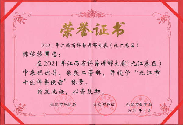4月19日,由市科学技术局、市科学技术协会、市教育局联合主办的“崇尚科学,自立自强”为主题的科普讲解大赛暨2021年江西省科普讲解大赛九江赛区预选赛在市图书馆举行。公司XC体育A2051班陈楦楦同学讲解的《一针疫苗一份心,科学接种护全家》赢得了大赛评委的一致认可,喜获第二名并被授予“九江市十佳科普使者”称号。