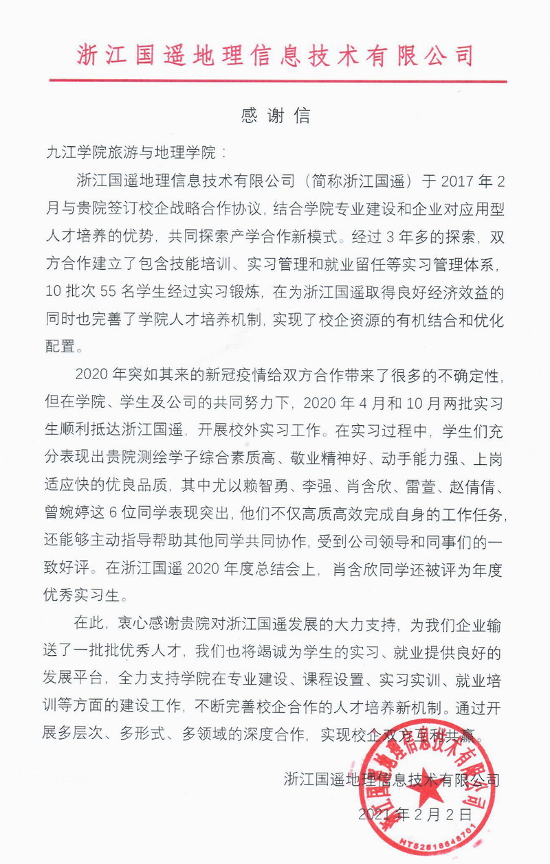 近日,XC体育合作实习单位浙江国遥地理信息技术有限公司(以下简称浙江国遥)发来感谢信,对2017级地理信息科学专业员工赖智勇、李强,2018级人文地理与城乡规划专业员工肖含欣、雷萱、赵倩倩、曾婉婷6位同学工作期间表现突出给予表扬。同时,肖含欣同学还在浙江国遥2020年总结会上被评为年度优秀实习生。