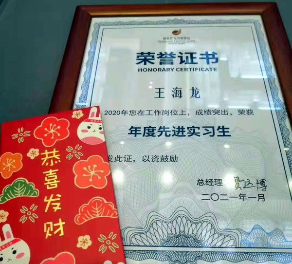 同时,A1861 王海龙同学获得镇海开元名都酒店2020年度先进实习生,就职于义乌三鼎开元名都酒店的黄腾同学获得酒店2020年度优秀员工。就职于西安开元大酒店的A1611班梁玉英同学获得最佳培训质检员称号。