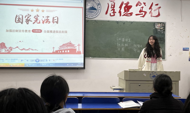 二是开展“学宪法,讲宪法”主题班会活动。12月3日晚,公司组织2023级员工利用晚点名时间在竞知楼各班教室开展“学宪法,讲宪法”主题班会活动,旨在贯彻落实习近平法治思想和习近平总书记关于宪法法治教育的重要指示精神,深入学习宪法,增强宪法意识,提高宪法素养。活动伊始,由主讲人带领大家走进宪法。指出宪法是国家的根本大法,规定着国家最根本的经济、政治和社会制度,公民的基本权利和义务,以及国家机构组织和活动的基本原则。紧接着,主讲人继续深入,进一步完善了同学们宪法相关的知识,帮助同学们全面了解我国宪法的基本内容和精神要义,深刻认识宪法在国家法律体系中的重要地位和作用。最后,同学们共同学唱《宪法伴我们成长》。“红旗长扬,我们迎着朝阳,成长路上,聆听宪法雄壮的声响,我们自立我们自强,是她伴随我们成长……”同学们齐声共唱宪法歌曲,动听的旋律和深刻的歌词犹如一颗种子,将宪法精神深植于同学们的心田,用歌曲的方式表达了对宪法的敬意和尊重,激发了青年员工对宪法学习的热情。