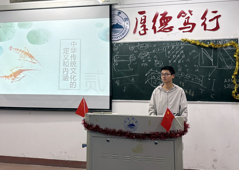 随后各班主讲人以ppt的形式,从“中华文化的历史渊源”“中华精神的古今渲染”“中华民族的异域风情”“中国人民的人文情怀”四个方面介绍了中华传统文化的主要内容,列举了有关传统文化的具体表现形式等知识,同学们沉浸其中,仿佛穿越时空,亲眼目睹了古代文人墨客挥毫泼墨的潇洒,感受到了民间艺人巧夺天工的技艺。这不仅是一场视觉的盛宴,更是一次心灵的洗礼,使同学们深深地感受到中华传统文化的博大精深。最后主讲人发出积极响应“保护传统文化”号召的倡议,同学们一起感受了中华传统文化的魅力,并在心中埋下了保护中华传统文化的种子。