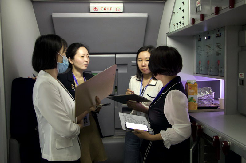 此次考评工作分为舱外考核的安全保障、应急医疗部分和舱内考核的地面检查、空中服务、应急处置、语言应用部分。