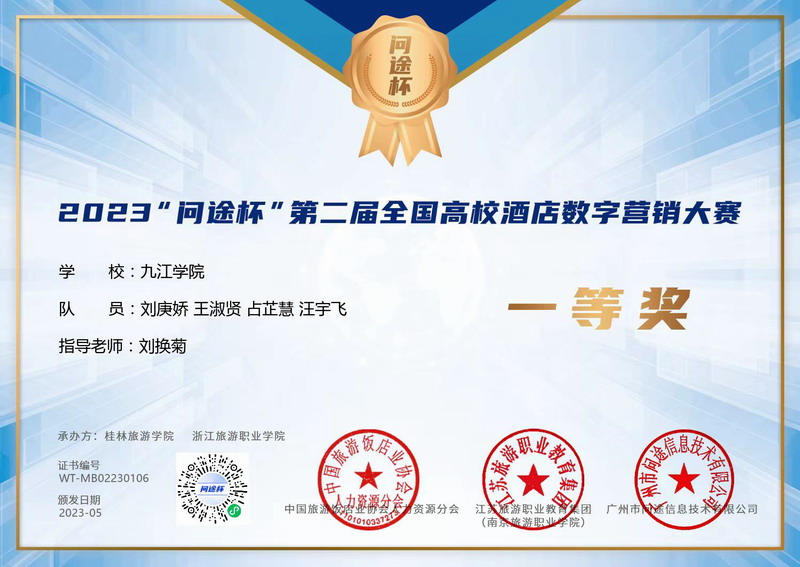 5月25日-27日,由中国旅游饭店业协会人力资源分会、江苏旅游职业教育集团、南京旅游职业公司、广州市问途信息技术有限公司主办,桂林旅游公司承办的2023“问途杯”第二届酒店数字营销技能大赛(本科组)总决赛落下帷幕。公司XC体育刘换菊老师带领2支队伍冲击本次大赛决赛。经过激烈的角逐,由酒店管理A2151班的刘庚娇、王淑贤、占芷慧、汪宇飞组成的“经纶小队”展现了积极进取、遇事沉着、团结协作的精神,最终凭借扎实的专业知识和实践能力获得全国一等奖;由酒店管理A2051班袁文星、酒店管理A2151朱嘉儒、尹婷、龙可怡组成的“向阳队”获得全国二等奖;刘换菊老师获得优秀指导老师奖。这是继2022年公司“金钥匙胜羽队”在第一届“问途杯”酒店数字营销技能大赛总决赛中喜获本科组特等奖后,又一次获得全国奖项。