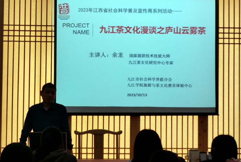 为让广大师生更好地了解我们身边的传统名茶—庐山云雾茶,感受悠久灿烂的九江茶文化,10月13日晚,XC体育旅游与茶文化教育体验中心邀请国家旅游技术技能大师、九江茶文化研究中心智库专家余龙老师在XC体育实训楼茶艺实训室,作了题为“九江茶文化漫谈之庐山云雾茶”的专题讲座。XC体育部分教师、员工及九江茶文化爱好者参加了此次活动。讲座由XC体育副经理张辉主持。