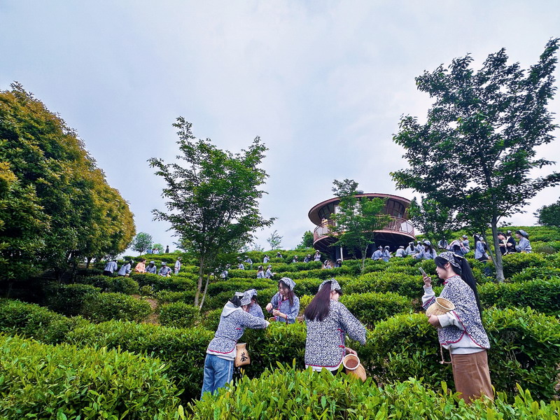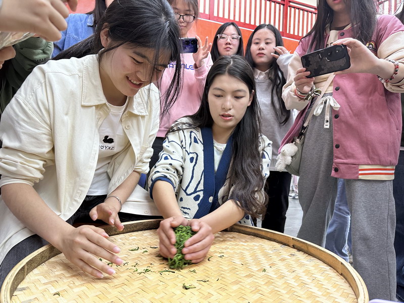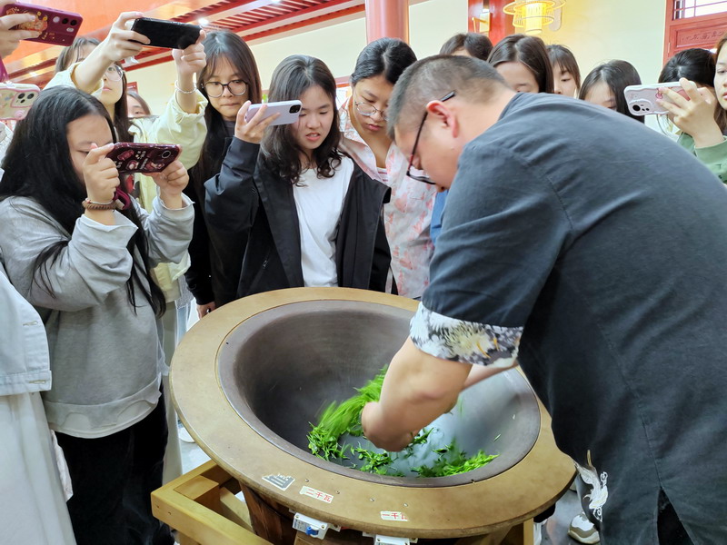 下午,师生们深度体验了“庐山云雾茶制作技艺”,穿上采茶服、挎上小茶篓,在老师的指导下完成了技艺的第一步“采摘”。随后在非遗传承人欧阳老师的示范指导下,完成了茶叶的“摊青”、“杀青”、“揉捻”、“理条”、“烘干”的完整制作流程。作为茶文化不可或缺的一环,大家还在特邀老师—九江藏源食用农产品开发有限公司主理人何浩琴女士及其团队成员手把手的指导下完成了佐茶佳品“茶酥”的制作,分别体验了“桃花酥”和“幸运酥”的制作流程,还有同学发挥了自己的创意,创作出了自己独一无二的茶酥作品。茶酥烤制完成后,大家品着自己炒制出来的茶,尝着亲手做出来的茶酥,成就感满满。
