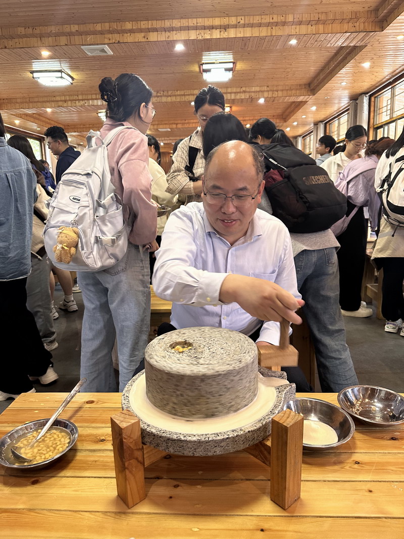 参与课程实践的老师和同学们在仪式结束后开启了充实的“非遗体验日”。师生们首先来到“庐山石磨体验馆”,在学习了石磨碫制技艺的相关知识后,用非遗传承人黄森林亲手碫制的石磨磨制了豆浆,亲手将豆浆过筛、生火煮制豆浆并于午餐亲口品尝了自己的劳动果实。同时,师生们还在午餐中品尝到了非遗项目“星子八大碗”和海庐创新特制的“庐山云雾茶餐”,在品尝美食的同时深入了解了每道菜的寓意,也开拓了思维,体会到了“茶+餐饮”的别样搭配。