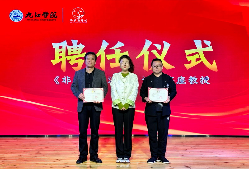 在热烈的掌声中,夏英书记与欧阳国松董事长签订了“教学实习实践基地”及《非遗里的江西》校政企课程合作协议并授牌,课程负责人郭清博士向非遗项目“庐山云雾茶制作技艺”传承人欧阳国松及“庐山石磨碫制技艺”传承人黄森林颁发了课程客座教授聘书。