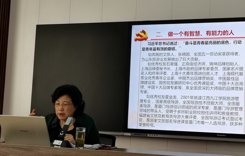 吴桃娥教授在讲座中列举了诸多同学们感兴趣的或者熟悉的人与事,大大增强了同学们对相关内容的印象与理解。例如在倡导同学们要养成爱学习的好习惯时,她就以公司优秀员工、上海品牌委秘书长、上海市政府品牌专家委员、国家名片提名人和终审评委石章强为例,介绍他在校期间酷爱读书坚持写作的优秀事迹。在讲到大学要插上两个翅膀一个叫理想一个叫毅力时,她以公司另一位优秀员工、国家高级导游、全国导游技术技能大师、全国最美导游霍金龙为例,分享他成为国家文旅部名导进课堂厦门市唯一入选高级导游的背后动人故事。在讲到如何培养审美能力时,她以大家熟悉的蝶湖左岸和旅游管理省级实验教学中心简约唯美的专业实验室风格与环境格调为例,引导同学们不仅要学习美学理论与知识,还要善于发现生活学习和身边的各种美,着力提升美学与审美素养,推动相关工作更好地发展。