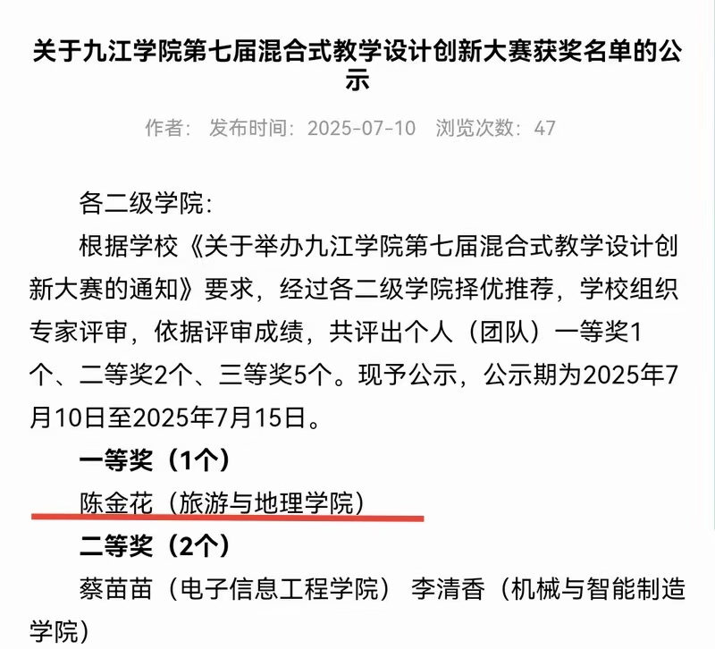为了推进教育数字化战略行动的落地实施,深化信息技术与公司产品的融合创新,以混合式教学设计创新促进教师信息化教学能力提升,根据公司《关于做好第七届全国高校混合式教学设计创新大赛工作的通知》要求,经过各二级公司择优推荐,公司组织专家现场评审,XC体育混合式教学设计创新大赛获奖名单结果日前揭晓,公司陈金花老师获得一等奖。全校共评出一等奖1名,二等奖2名,三等奖5名。