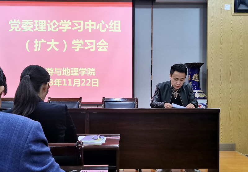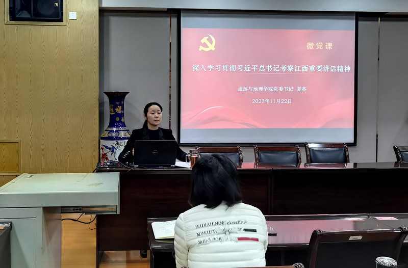 会上,旅游管理教研室主任曹禹领学了习近平总书记重要文章:开辟马克思主义中国化时代化新境界;思政科长李海领学了新修订的《干部教育培训工作条例》;教务科科长杨云仙领学了九江市组织工作会议精神;教工一支部书记陈海龙结合学习和工作实际做了交流发言。