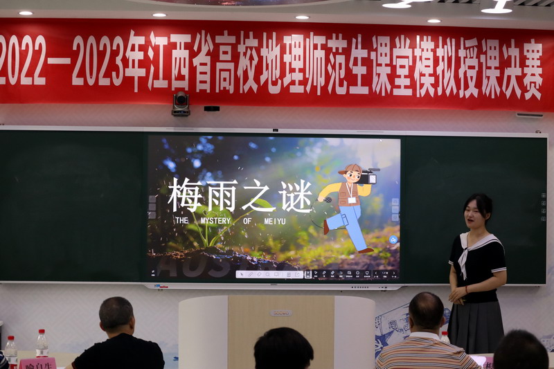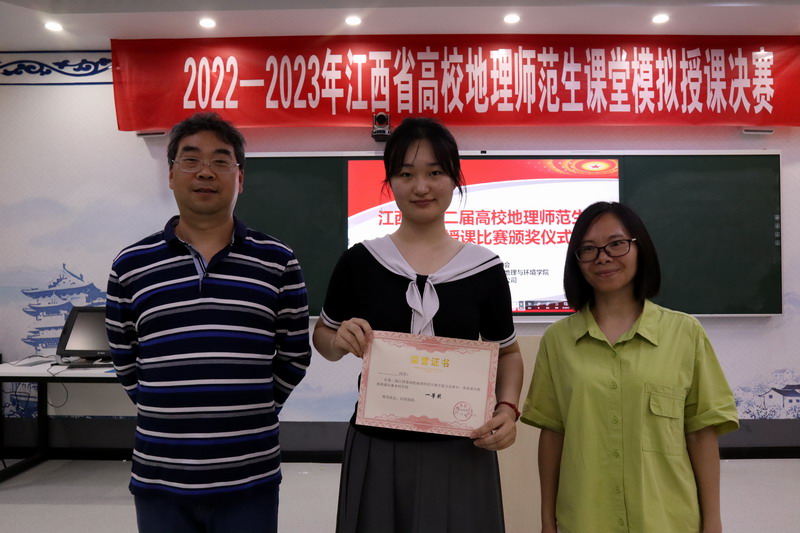 5月19日—20日,2022-2023年江西省高校地理师范生课堂模拟授课比赛决赛在江西师范大学举行,公司2019级地理科学专业员工任淇琪同学在指导老师王文彩的精心指导下,在2022年江西省高校地理师范生教学能力比赛的第一阶段胜出,顺利进入现场课堂模拟授课决赛。经过激烈角逐,任淇琪同学凭借作品——“梅雨之谜”,荣获本科组模拟课堂授课比赛一等奖,指导老师王文彩获得优秀指导老师荣誉称号。