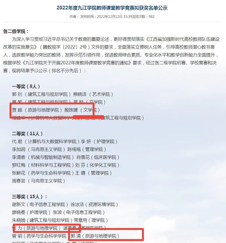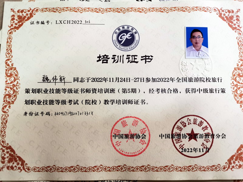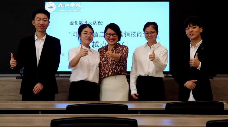 刘换菊老师指导,彭舒琪、廖清怡、袁文星、张艺聪4名同学组成的“金钥匙胜羽队”在第一届“问途杯”酒店数字营销技能大赛总决赛中喜获本科组特等奖,刘换菊老师荣获“优秀指导老师”奖。雷彬老师指导的《数建古村——数字赋能古村保护与振兴的创新平台》项目获第八届江西省“互联网+”老员工创新创业大赛“青年红色筑梦之旅”赛道公益组铜奖。3名青年教师在2022年度公司教师课堂教学竞赛中喜获佳绩,贾超老师获得一等奖,张力、郭清两位老师获得三等奖。沈艳晶老师荣获公司2022年辅导员素质能力大赛一等奖。陈金花老师荣获公司第二届教师教学创新大赛中级及以下组三等奖。陈金花老师和刘焕菊老师在公司混合式教学设计创新大赛中分别获得二等奖和三等奖。5名教师在公司2022年教师节庆祝大会上受到表彰,雷彬、严宽荣、赵军凯荣获优秀教师称号,徐培荣获优秀教育工作者称号,王妍荣获优秀班主任称号。张建星、贾超获得公司就业工作先进个人称号。魏伟新、宋婷、严宽荣获得中级旅行策划职业技能等级考试(院校)教学培训师证书。4名教师获省旅游协会通报表扬,李松志荣获 “突出贡献人物”称号,严宽荣、乔秋敏荣获“教学名师”称号,魏伟新荣获“杰出青年教师”称号。