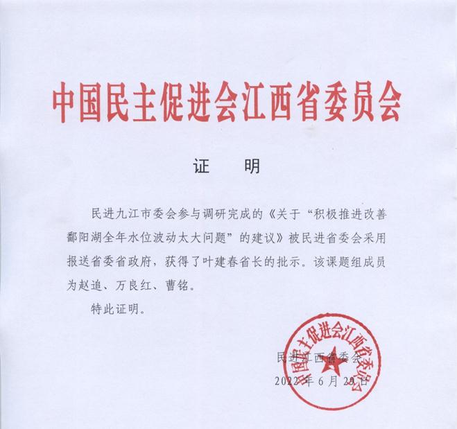 今年1月初,民进江西省委会围绕《民进中央2021年对口江西省开展长江生态环境保护民主监督报告(情况反馈稿)》中有关“积极推动改善鄱阳湖全年水位波动太大问题”的建议组织了专题调查研究。公司教师、民进XC体育支部会员赵追,曹铭作为长江生态环境保护民主监督工作民进江西省专家参与调研,他们参与完成的《关于“积极推进改善鄱阳湖全年水位波动太大问题”的建议》被民进省委会采用报送省委省政府,获得了省政府叶建春省长肯定性批示。