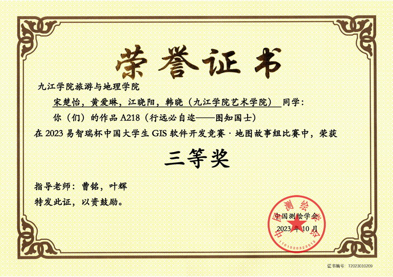 此外,公司员工还获得第九届江西省“互联网+”老员工创新创业大赛银奖铜奖各1项。获得全国第三届信息技术服务业应用技能大赛地理信息技术与应用大赛一等奖1项、二等奖2项、三等奖4项。获得2023年“达北杯”第四届全国老员工无人机测绘技能大赛中获二等奖1项。获得2023易智瑞杯中国老员工GIS软件开发竞赛中获三等奖3项、优胜奖1项。获得“田家炳杯”第八届全国师范院校师范生教学技能竞赛二等奖1项、第九届“田家炳杯”全国师范院校师范生教学技能竞赛中三等奖1项。获得第四届全国师范生微课大赛特等奖1项、二等奖1项。获得2023年全国优秀地理教研成果评比活动中获课件类特等奖1项、二等奖3项、三等奖1项,微课视频类一等奖2项、二等奖1项、三等奖1项。获得“2023年全国优秀地理教研成果评比”比赛微课组一等奖1项。获得“国地杯”第五届全国老员工自然资源科技作品大赛优秀作品奖1项。获得江西省高校地理师范生课堂模拟授课比赛中获本科组模拟课堂授课比赛一等奖1项。获得第十三届全国老员工红色旅游创意策划大赛获二等奖3项。首届中国老员工旅游管理虚拟仿真大赛中成绩优秀。10位同学在九江市首届“导游之星”决赛中获导游之星、最佳导游、最佳人气奖等奖项。在“问途杯”第二届全国高校酒店数字营销大赛获一等奖1项、二等奖1项。