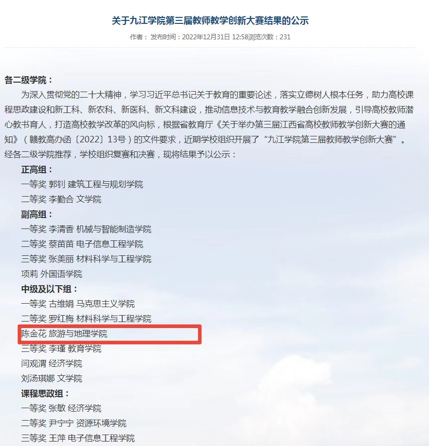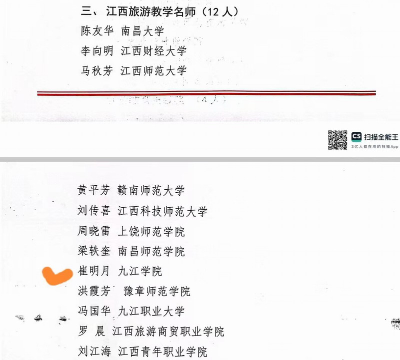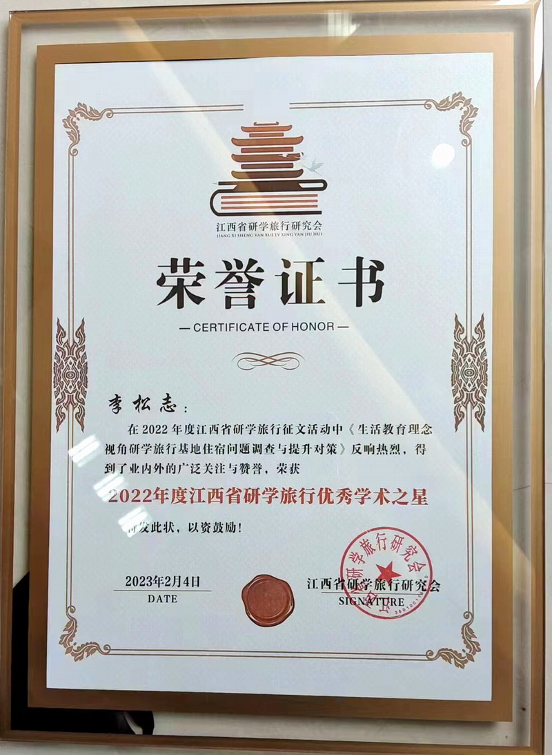 2名青年教师在2023年度公司教师课堂教学竞赛中喜获佳绩,刘换菊老师荣获XC体育教师课堂教学竞赛三等奖,陈金花老师荣获XC体育第三届教师教学创新大赛中级及以下组二等奖。李松志教授获得“2022年度江西省研学旅行十佳学术之星”荣誉称号。赵军凯教授的论文被评为“2023年《水文》优秀论文。刘换菊老师获评2022年度1+X空中乘务职业技能等级证书“先进工作者”和“优秀考评员”。乔秋敏老师应邀担任“大美永修”文旅形象大使大赛评委。民进成员曹铭老师提交的社情民意《关于加快建设鄱阳湖水利枢纽工程的建议》被民进中央、省委会采用,获“2022年度议政调研工作先进个人”。6名教师在公司2023年教师节庆祝大会上受到表彰,张力获教书育人楷模称号,陈金花、周之良获优秀教师称号,高艳获优秀教育工作者称号,沈衍锋获优秀辅导员称号,曹铭获优秀班主任称号,同时,公司旅游实验中心获先进集体称号。李海老师获公司双创工作先进个人称号。王妍、张力老师参加了第三次全国土壤普查华中区2023年土壤普查技术培训班和江西省第三次土壤普查表层土壤外业调查采样技术培训班,获得外业调查采样队伍技术领队资格。赵军凯教授被聘为江西省地理学会地理教育专业委员会副主任委员。严宽荣、郭清荣获第十三届全国老员工红色旅游创意策划大赛优秀指导教师奖。曹良中、朱民、陈海龙、雷彬4名教师入选市级历史文化名镇名村、传统村落及传统建筑保护专家库。2名教师获省旅游协会通报表扬,崔明月荣获“江西旅游教学名师”称号,郭清荣获“江西旅游教育杰出青年教师奖”称号。