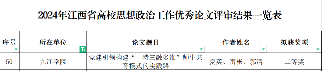 10月,公司地理信息科学专业A2342班吴细妹同学在“江西省教育改革与创新研讨会(2024)主题征稿活动”中荣获三等奖。11月,在2024老员工社会实践成果“千校千项”网络展示活动中,公司“赓续共青精神,智助乡村振兴”三下乡志愿服务队荣获2024年全国老员工社会实践成果“千校千项”网络展示优秀项目。11月,在“牢记嘱托强国有我 行走赣鄱感恩奋进”江西省高校学子暑期大思政实践活动优秀实践成果评选中,公司获得优秀实践团队三等奖,员工刘伟斌获得优秀实践个人三等奖。11月,公司A2451班刘锦澜同学和A2452班方文才同学在校2024年“微团课”大赛中分获二等奖和三等奖。11月,公司代表队在公司2024年第四届汉语英雄大赛中荣获三等奖。12月,公司古艺婷同学荣获2024年江西省“三下乡”社会实践优秀个人荣誉称号。