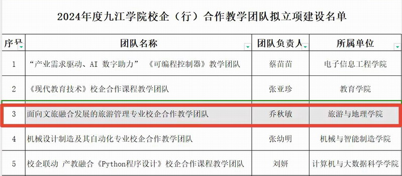 公司旅游管理国家级一流专业和旅游管理省级教学团队正在建设阶段。公司乔秋敏老师申报的“面向文旅融合发展的旅游管理专业校企合作教学团队”获批立项建设。乔秋敏老师申报的校级教学成果奖青年培育项目获教学成果奖青年培育项目一等奖。严宽荣团队的《基于行动导向的<酒店客户管理>实践教学方案设计》和崔明月团队的《基于共创式教学法的<职业形象塑造>实践课程创新方案》获第十六届全国商科教师教育实践教学大赛“课程建设实践教学方案设计”二等奖。