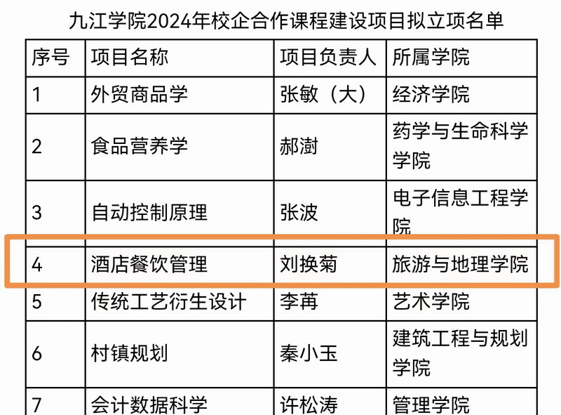 贾超老师申报的《酒店英语(上)》和刘换菊老师申报的《酒店餐饮管理》2门课程获批XC体育课程思政示范课程;刘换菊老师申报的《酒店餐饮管理》课程获批XC体育校企合作课程;曹良中老师主讲的《差之毫厘,谬以千里——地理配准的原理与实现》案例、刘换菊老师主讲的《“国宴——中国最顶级的饭局”今昔对比》案例和李翔宇老师主讲的《锦心绣口绘山河——全球化语境下旅游从业人员的核心素养图谱》3项课程思政教学案例集获批校级优秀课程思政教学案例。郭清老师主编的校级立项教材《江西省非物质文化遗产保护与发展》已于2024年1月出版,朱民博士主编的《中国传统村落保护与发展》纸质教材获批2024年校级教材建设立项项目。刘换菊教师报送的“劳动教育典型案例”《创新“5+1”劳动育人模式,提升员工劳动素养》荣获二等奖。