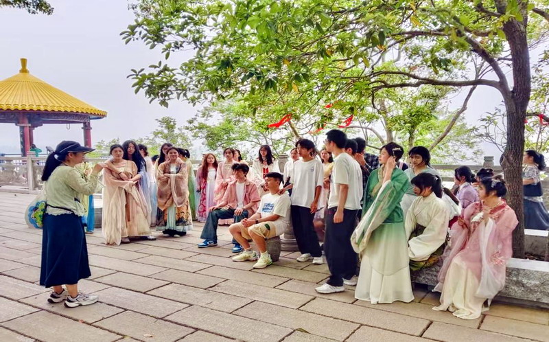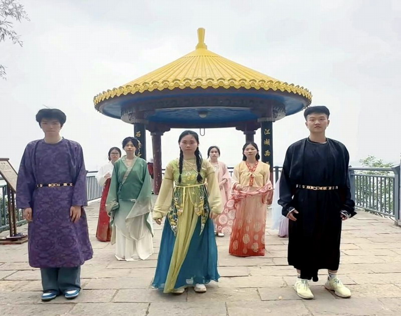 活动中,身着古装的学子们以“古今对话”形式沉浸式调研石钟山:通过视觉、听觉、触觉多维度解析景区“声形交融”的五感美学设计,结合苏轼《石钟山记》文化叙事脉络,实测汉服旅拍互动传播效能。