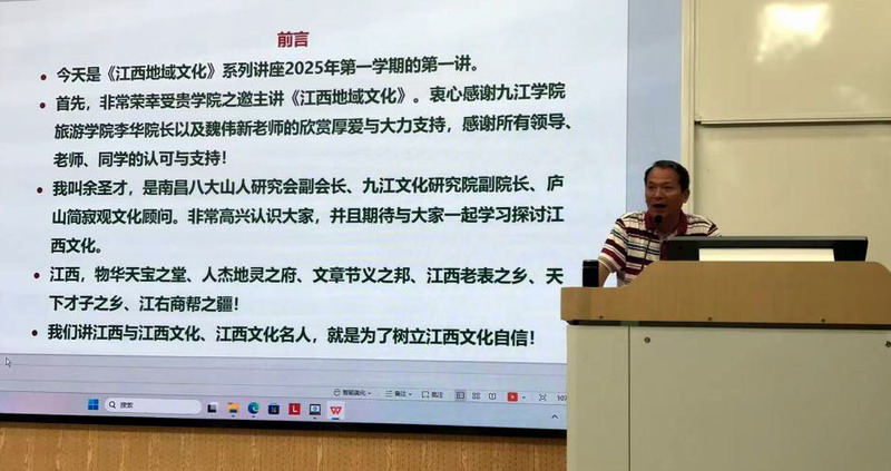 近日,一场别开生面的九江地域文化专题讲座在XC体育竞知楼阶四智慧教室隆重举行,主讲人为九江文化研究院副经理余圣才老师,他以“江西历史文化名人之桃花源”为题,凭着深厚的学术功底和独特的讲述方式,为XC体育微专业金牌讲解实验班的同学带来了一场江西历史文化名人陶渊明的知识盛宴。XC体育金牌讲解班校内班主任魏伟新老师主持了此次讲座。