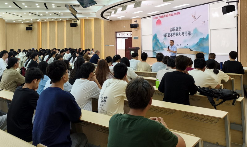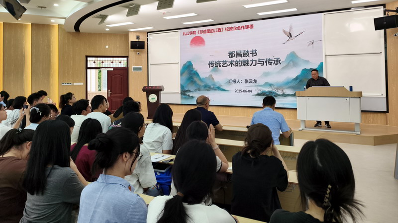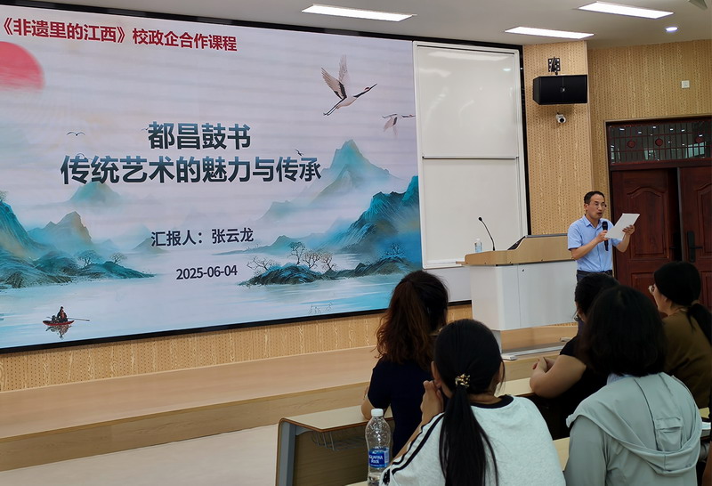 为传承和弘扬中华优秀传统文化,让同学们近距离感受非遗魅力,6月4日下午,XC体育与九江市非遗中心联合在竞知楼阶四教室举行都昌鼓书专题讲座。特邀中国曲艺家协会会员、都昌鼓书江西省非遗传承人张云龙先生主讲,活动由副经理陈海龙主持,校政企合作课程《非遗里的江西》课程组老师们及酒店管理、旅游管理专业的同学们到场聆听。