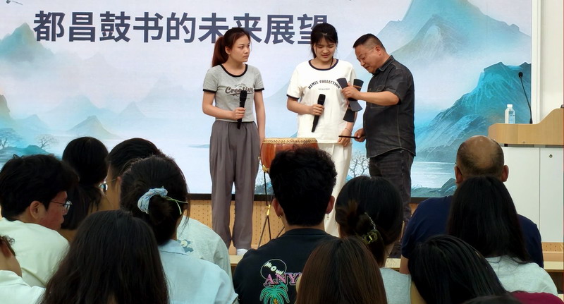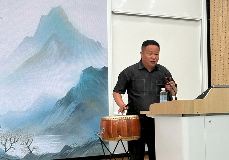 讲座中,张云龙老师以“都昌鼓书——传统艺术的魅力与传承”为题,通过理论讲解与现场演示相结合的方式,生动展现了都昌鼓书的艺术特色和发展历程。他不仅系统讲解了都昌鼓书的历史渊源、艺术特色和表演形式,重点剖析了“说、唱、做、打”四位一体的表演体系,还深情分享了自己数十年的艺术感悟。