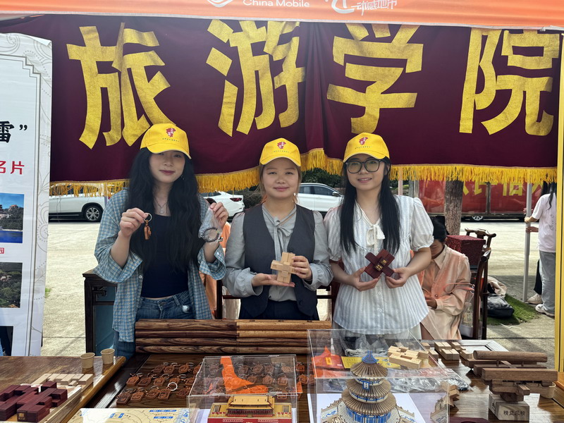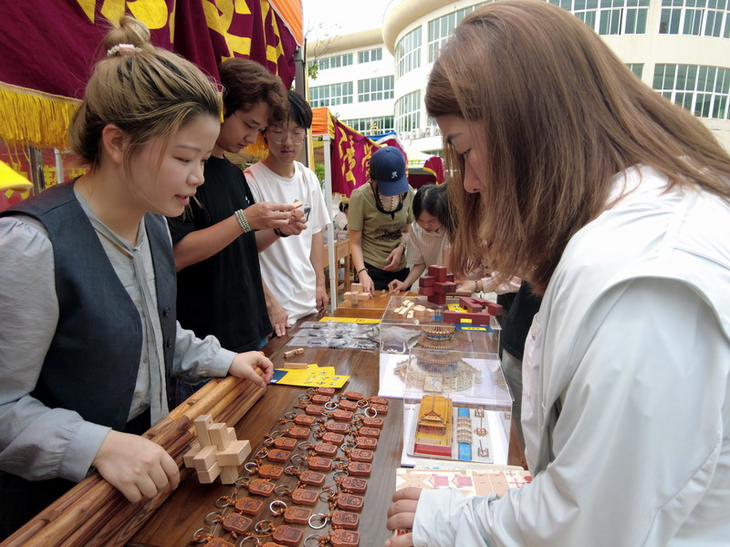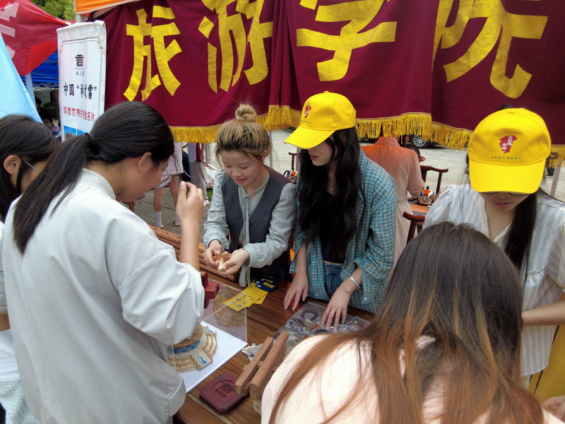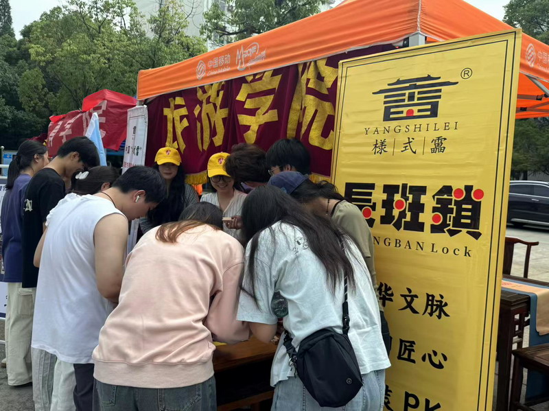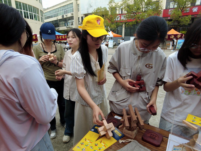 活动期间,XC体育展区成为现场焦点。源自清代皇家建筑世家“样式雷”智慧结晶的长班锁、精巧别致的样式雷钥匙扣、设计新颖的冰箱贴等系列文创产品甫一亮相,便引发热潮。团队成员与永修县样式雷匠艺轩文创有限公司合作,宣传“样式雷”建筑的文化与智慧,团队成员化身文化使者,用生动的语言讲述“样式雷”世家在紫禁城、天坛等皇家建筑中展现的精妙技艺。不仅细致讲解每件作品背后的文化故事与设计巧思,更亲自上阵进行动态展示。对核心展品“长班锁”,团队成员进行了详细的拆解与拼接演示,其精妙的榫卯结构与蕴含的古老智慧,令围观同学赞叹不已。