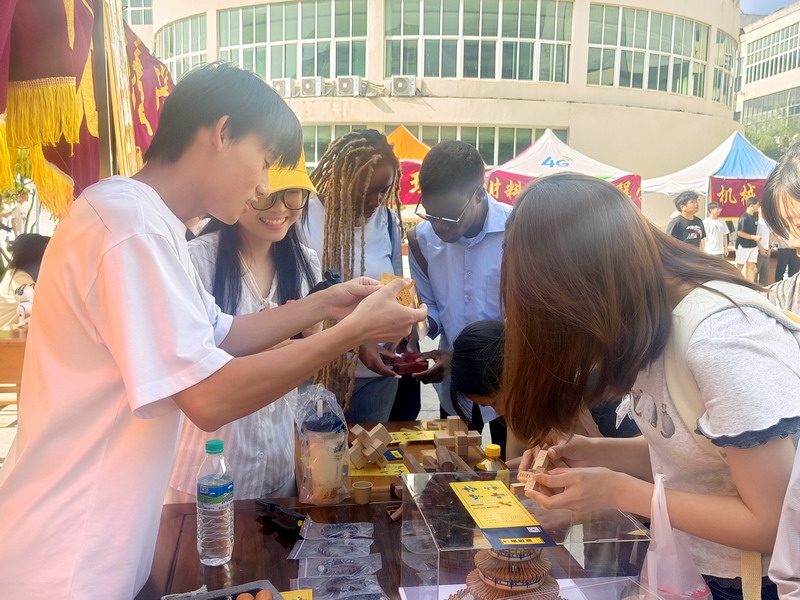 展区的独特魅力甚至吸引了数位外国职工驻足看看。他们对“样式雷”文化展现出浓厚兴趣,在团队成员耐心介绍后,他们饶有兴致地参与长班锁的拼接活动,在一次次尝试中感受榫卯结构的神奇,当成功完成拼接时,兴奋地与同伴击掌庆祝并惊呼:“amazing!”,外国职工惊叹于木质榫卯结构的精巧,反复用不太流利的中文说:“没有钉子却如此牢固,真是神奇!”现场气氛热闹而欢快。