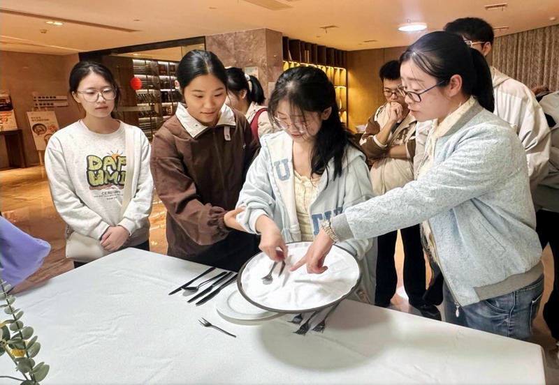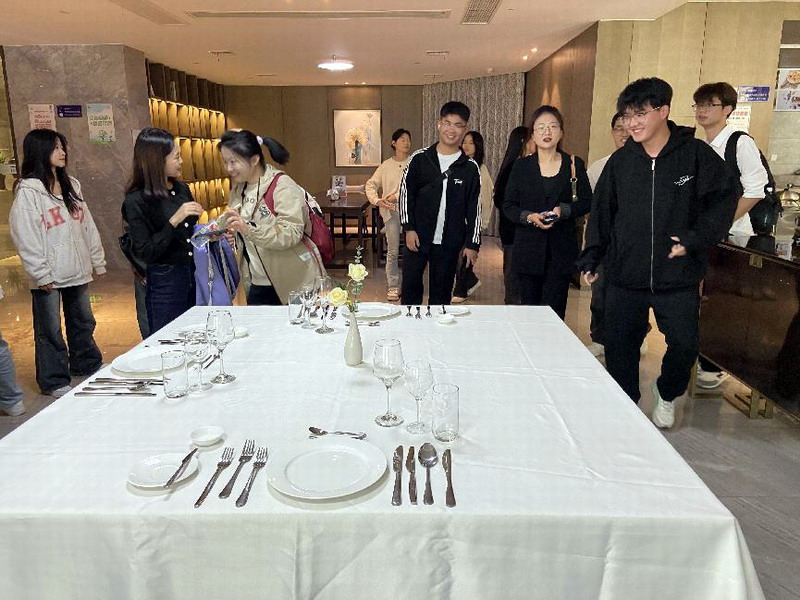 在西餐厅,张静老师亲自为同学们示范了正式的西餐宴会摆台。她细致地讲解了每一道程序,从餐具的摆放顺序到餐巾的折叠方法,每一个细节都力求完美。通过这次生动的现场教学,同学们不仅学到了实用的技能,还对西餐文化有了更深入的了解。